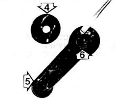 Отстранете дръжката на прозореца. За да направите това, поставете отвертка между шайбата "4" и дръжката "5" до оста на дръжката и отстранете ограничителя "6", вижте фигурата. Издърпайте дръжката на прозореца от оста. Веднага след изваждането поставете запушалката обратно в жлеба на дръжката.