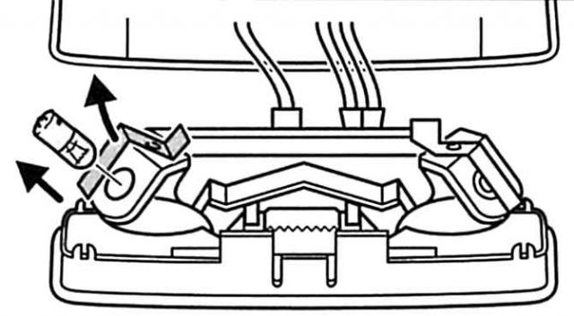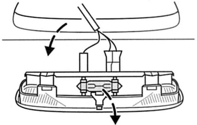 - Сразу замените переднюю софитную лампу (указана стрелкой), для замены задней лампы необходимо «разблокировать» вначале сбоку еще один отражатель.