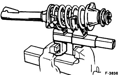 Установите амортизаторную стойку в приспособление и медленно сжимайте пружину до тех пор, пока не разгрузится верхняя опора пружины.