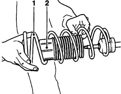 Если необходимо заменить только пружину, то медленно ослабьте пружину «1» и снимите гофрированный кожух «2». Если необходимо заменить только амортизатор, то пружину оставьте сжатой.