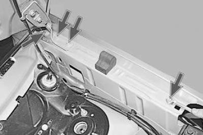 11. Выверните передний и задний болты верхнего крепления крыла к каркасу моторного отсека, два болта крепления петли капота к кузову и снимите крыло.