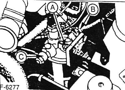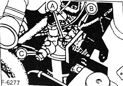 Если после отпускания пробки никакой жидкости не вытекает, отпустить пробку для удаления воздуха у выходного топливопровода «С», см. далее рисунок F-6277.