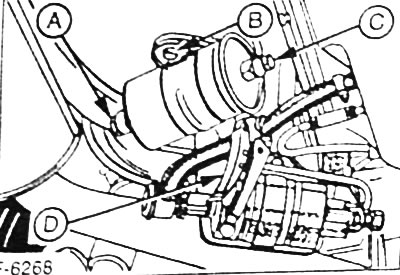 Открепить от держателя фильтра входной «В» и выходной «С» топливопроводы и закрепить их как можно выше, чтобы проливалось меньше топлива. А - гайки крепления топливного фильтра.