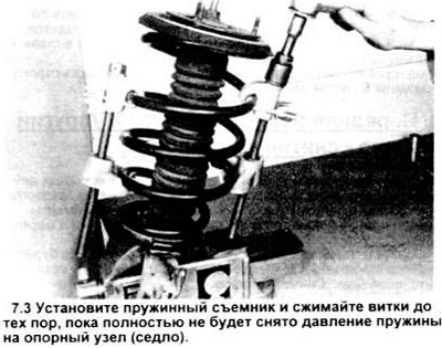 Предупреждение: разборка стойки достаточно опасна - будьте очень осторожны и строго следуйте всем инструкциям, чтобы не получить серьезных травм. Используйте только высококачественный съемник для пружин и выполняйте инструкции, прилагаемые к инструменту. Сняв винтовую пружину с блока стойки, отложите ее в безопасное изолированное место (лучше всего в металлическую коробку).