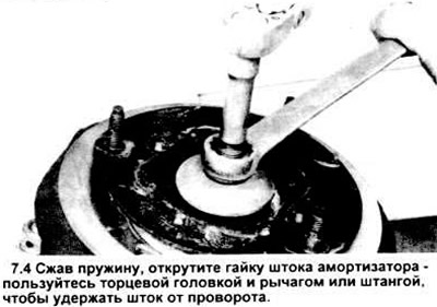 4. Отпустите гайку штока амортизатора, удерживая при этом ключом с головкой шток от проворота за его шестигранную поверхность (см. рисунок). Открутите гайку и снимите верхнюю вогнутую шайбу.