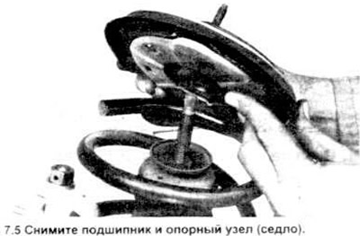 5. Снимите со штока подшипник, опорный узел (седло) и верхнюю опору (см. рисунок). Проверьте достаточно ли плавно работает подшипник в седле пружины - при необходимости замените.