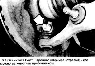 4. Отвинтите стяжной болт и гайку шарового шарнира от поворотного кулака (см. рисунок). Слегка приподнимите узел с помощью отвертки или рычага.