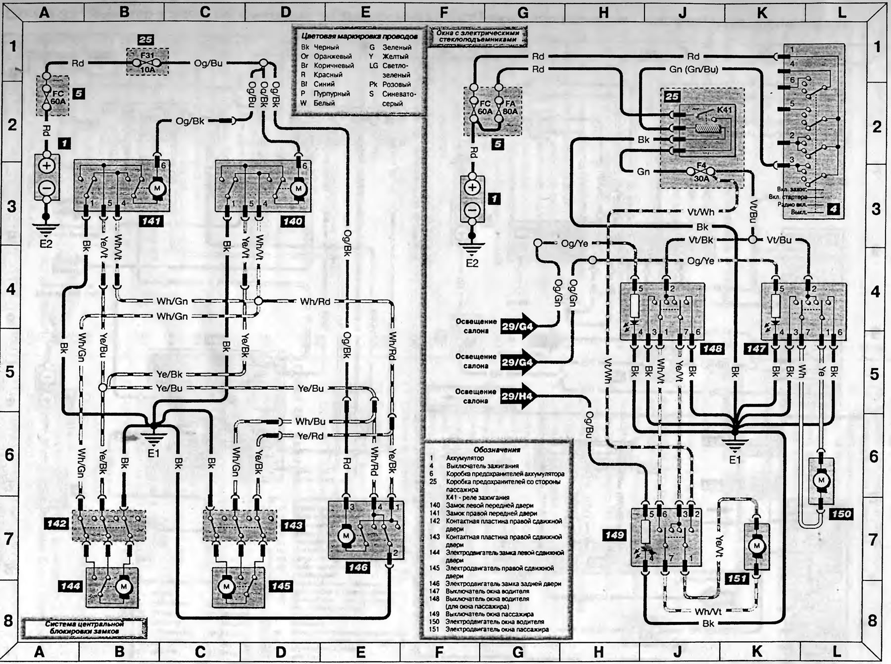 Схема 31. Система центральной блокировки замков и окна с электрическими стеклоподъемниками — модели с 1995 года